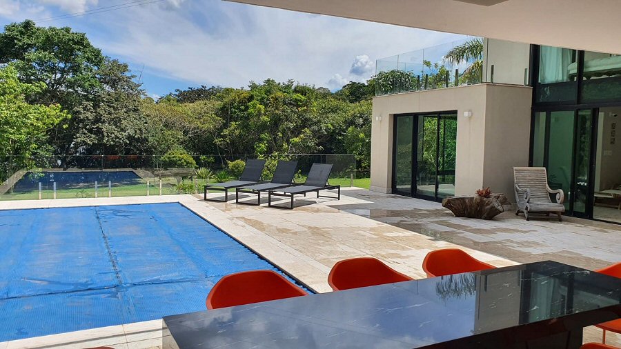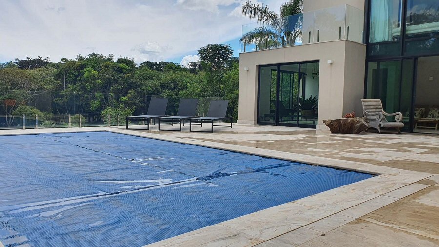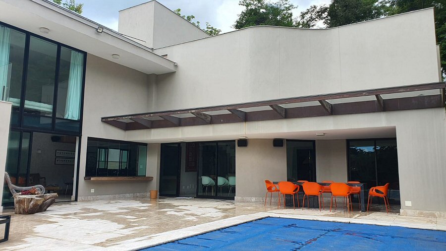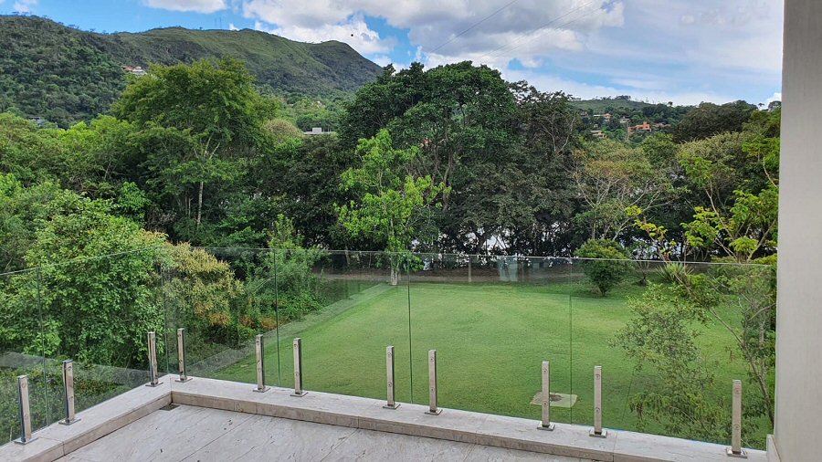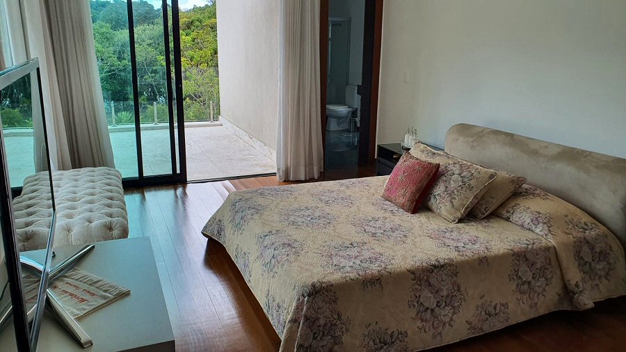 Casa alvenaria, na beira do lago, com vista definitiva, 500m² de área construída com estrutura de concreto armado, com 02 pavimentos, padrão alto luxo, contendo no piso superior: suíte ampla com piso em tábua corrida, varanda; ampla sala de TV/Som; 04 quartos, sendo 02 suítes: 01 ampla suíte, com o piso do quarto em tábua corrida e do banheiro em granito, varanda com vista definitiva para o lago; outra suíte com o piso do quarto em tábua corrida e do banheiro em granito; 02 quartos de solteiro com piso em tábua corrida; banheiro social com piso em granito e paredes em pastilha branca.
