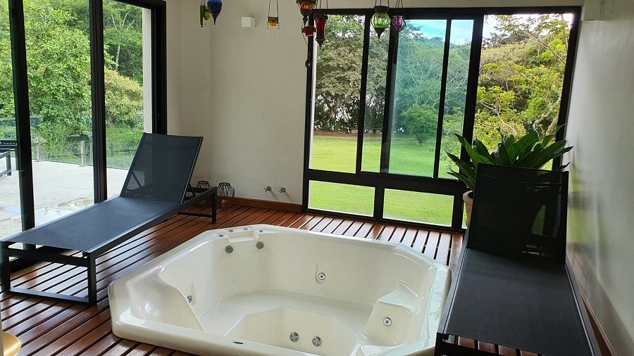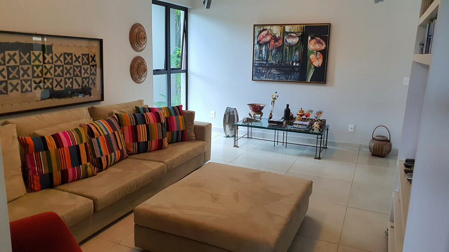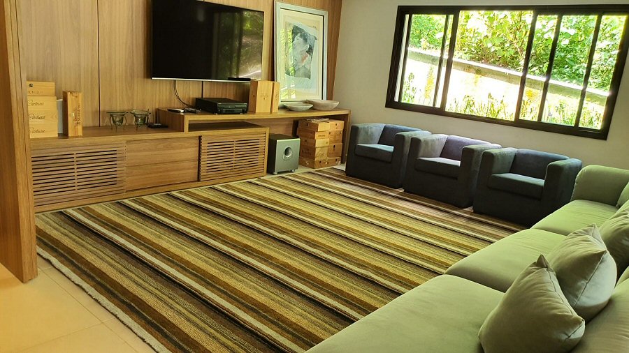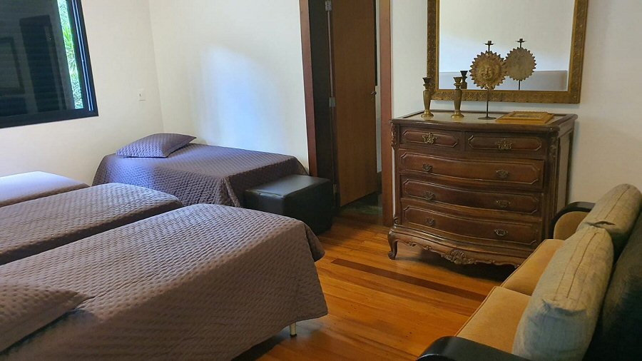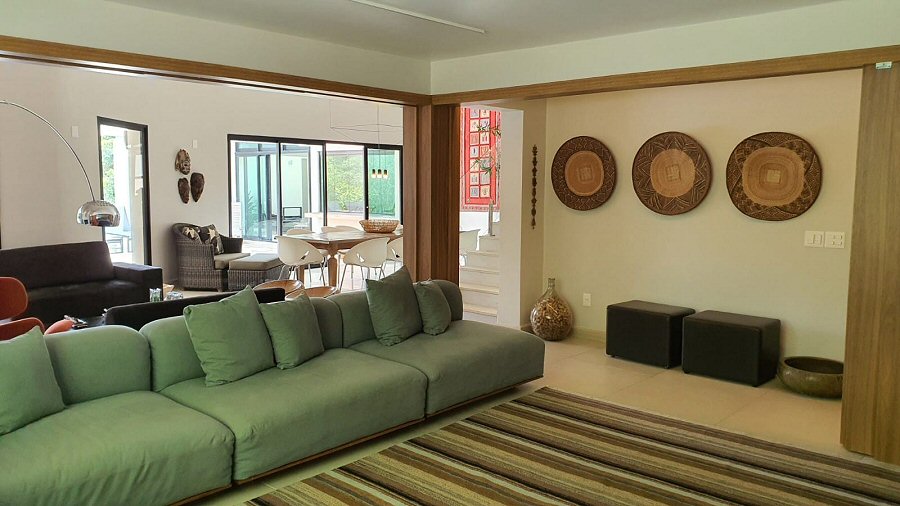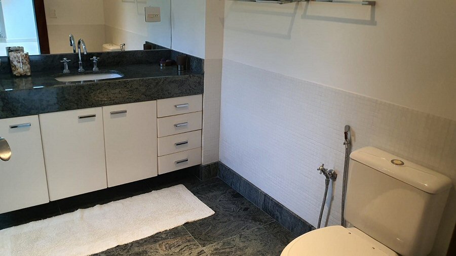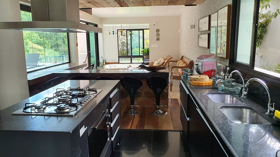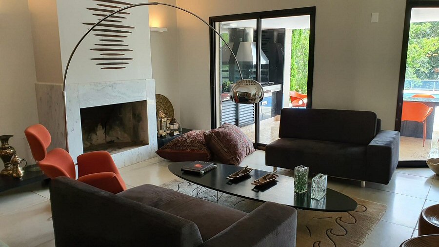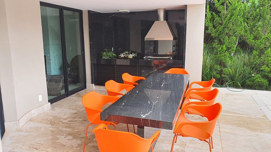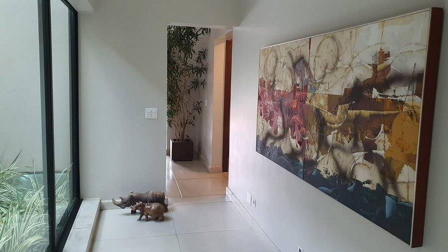 No pavimento inferior: ampla sala para 03 ambientes (TV/Estar e jantar); lareira; lavabo; corredor para ampla suíte, sendo o piso do quarto em tábua corrida e do banheiro em granito; cozinha com bancadas em granito e ilha para o fogão também em granito; área de serviço e banho de empregada com piso em granito, quarto de empregada com piso em tábua corrida; SPA com bancada gourmet, sala de banho com banheira de hidromassagem; banho social com piso em granito e paredes revestidas em pastilha branca; piscina em concreto armado em deck de madeira, amplo espaço de recreação; garagem para 04 carros; área ajardinada ampla. Todos os quartos, banheiros e cozinha têm armários embutidos em MDF. Decoração primorosa.