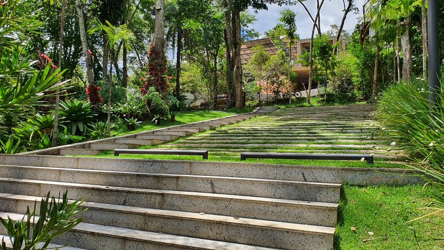 c) Grande gramado integrando a casa, em sentido a área de caminhada e lago. |